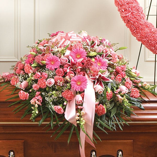 When you lose a close family member, you want to select a sympathy tribute that expresses all the feelings you have in your heart. Painstakingly crafted by our expert florists, this beautiful half casket cover features beautiful long stem roses, Asiatic lilies, white football mums and more. It is the perfect expression of an undying love that will last far beyond this difficult time. Send sympathy and funeral flower arrangements and plants from Bloom Funeral Flowers.